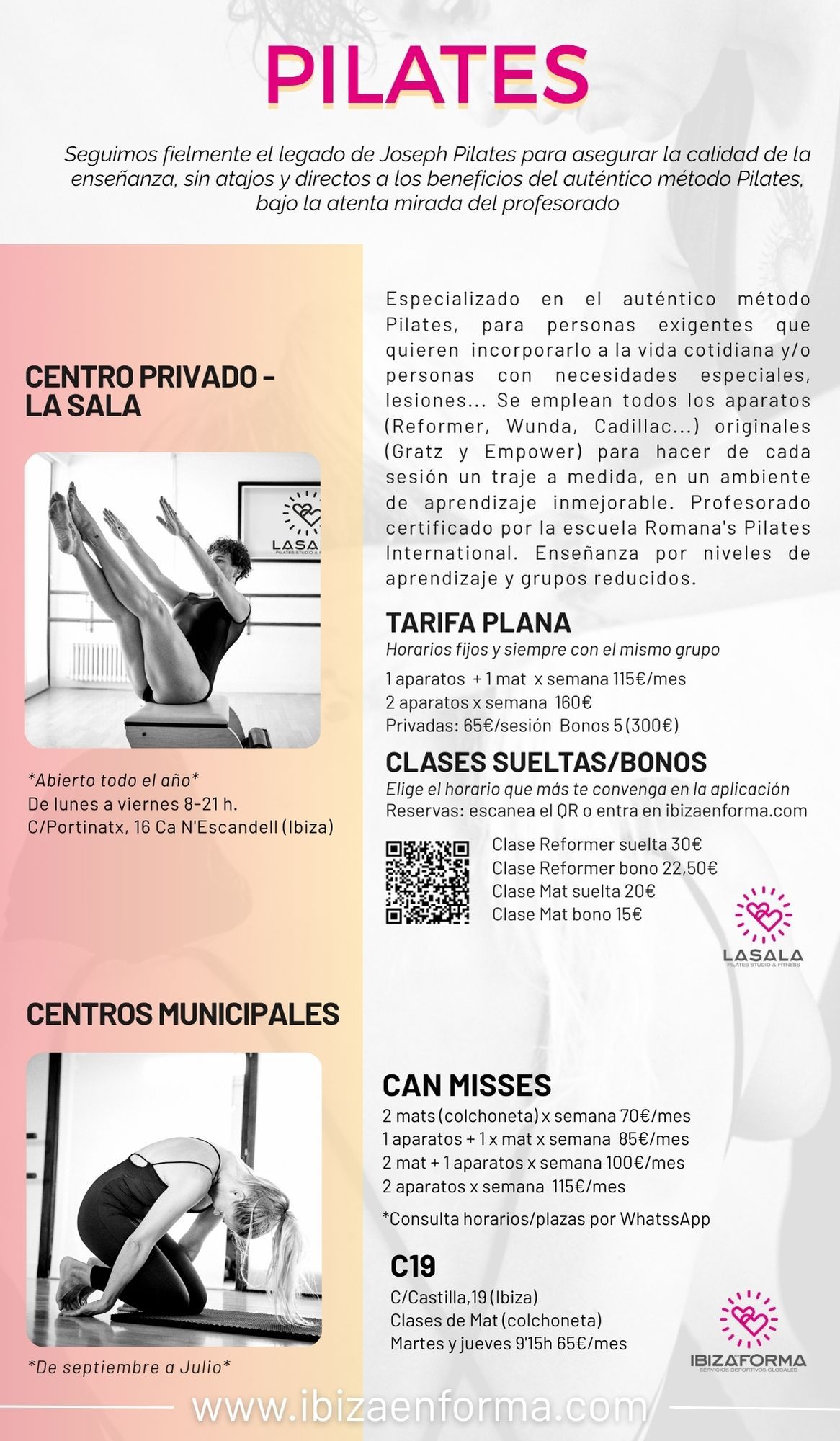 Básicamente nos dividimos en dos líneas: nuestro centro privado LA SALA, altamente especializado en la enseñanza del auténtico método Pilates y los centros municipales (Can Misses y C19).
